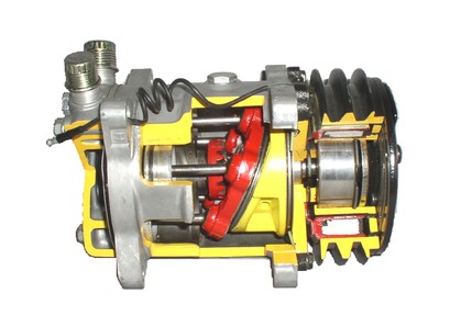 Компрессор – агрегат, обеспечивающий циркуляцию хладагента в герметичном контуре кондиционера. Существует три основных вида компрессоров: компрессоры поршневого, лопастного и спирального типов. Приводной вал всех типов компрессоров вращается от электромагнитной муфты, которая сама, в свою очередь, приводится во вращение от шкива коленчатого вала двигателя автомобиля через приводной ремень и потребляет мощность от 7 до 11 кВт (от 10 до 15 л.с.).
