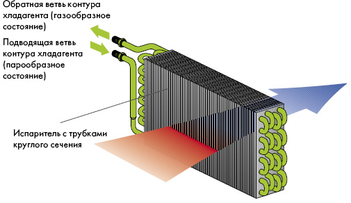 Испаритель – это теплообменник в котором происходит испарение хладагента с отбором тепла. Под воздействием теплого воздуха, который прогоняется вентилятором через ребра испарителя, хладагент закипает и переходит в газообразное состояние. При этом происходит отбор тепла из воздуха. Воздух, прошедший через оребрение испарителя, охлаждается, температура в салоне автомобиля понижается. Влага, содержащаяся, в воздухе конденсируется на испарителе, стекает и через дренажную трубку удаляется из автомобиля. Поэтому под автомобилем с работающим кондиционером можно увидеть лужу или влажное пятно. Таким образом воздух, который поступает в салон автомобиля, после прохождения через испаритель становится прохладнее и суше. Что обеспечивает комфортные условия водителям и пассажирам.